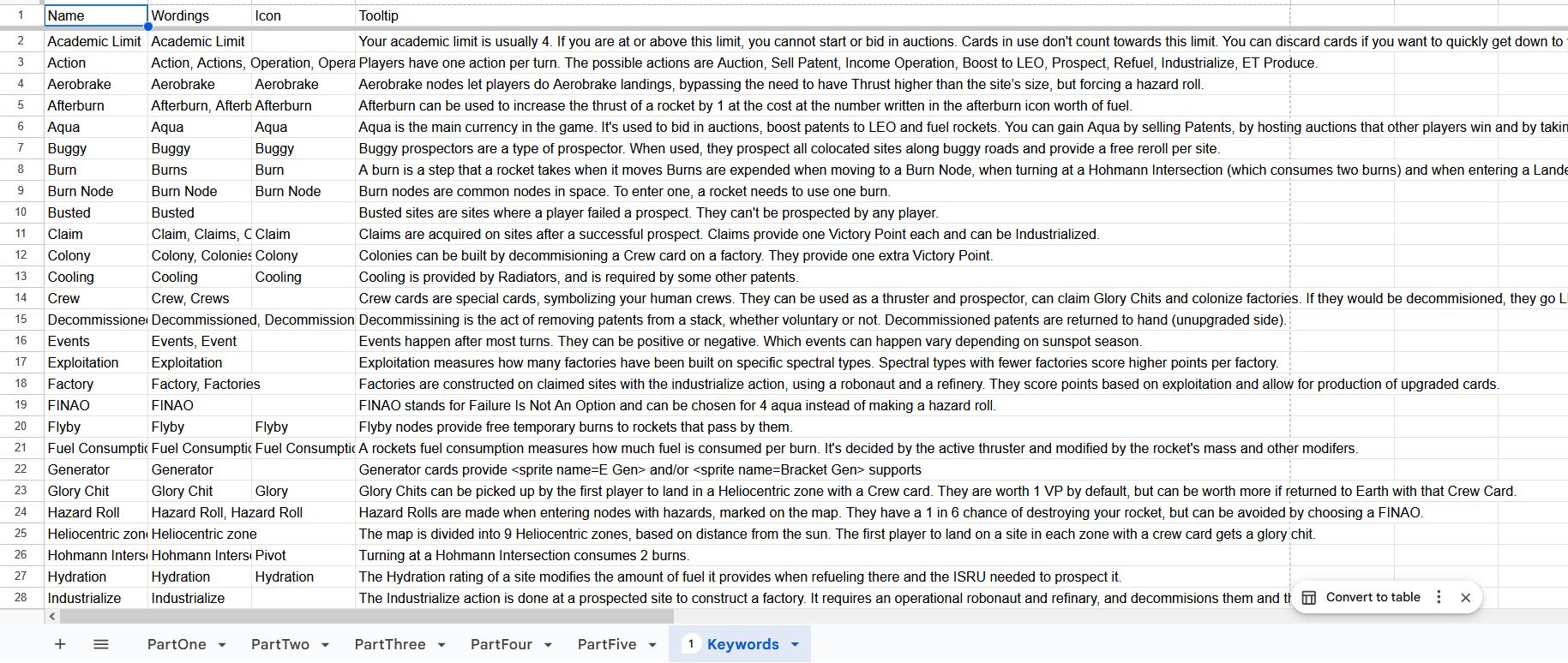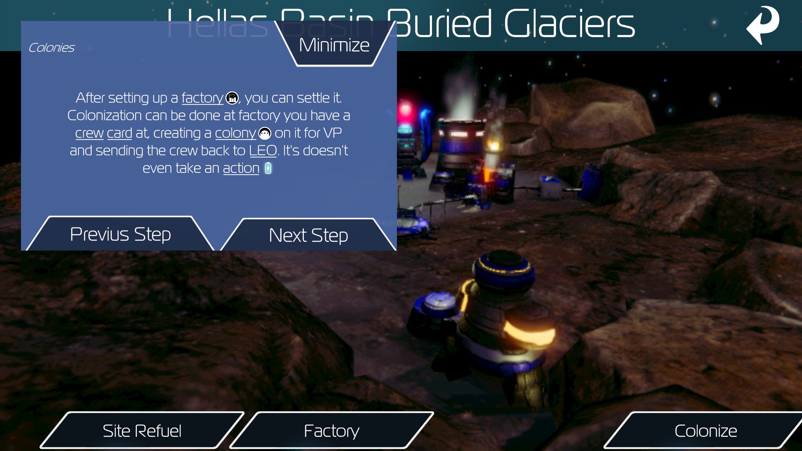 My main priority was making the tutorial, something very necessary due to the game's complexity (the board game has a complexity rating of 4.8 on BGG), long learning curve and basic UI. I began by playing the game and analyzing its (56 pages) rulebook, to plan out a tutorial and see what steps were needed.I knew I wanted the tutorial to be interactive, go through the core mechanics without being too long, and feature tooltips and modern UI design elements. So I decided to structure the tutorial in five parts; first steps and cards, rocket building, movement, sites and industrializing, and gameflow and goals.